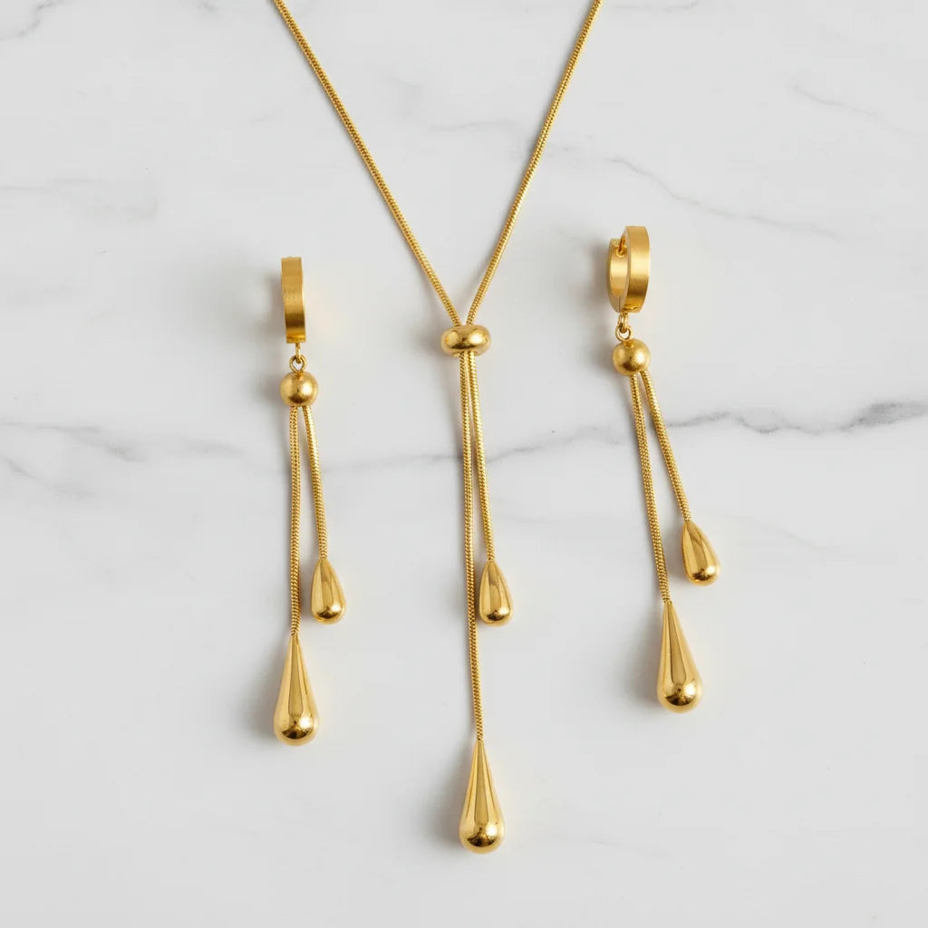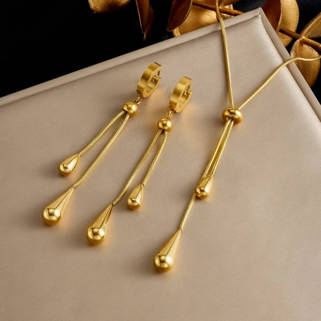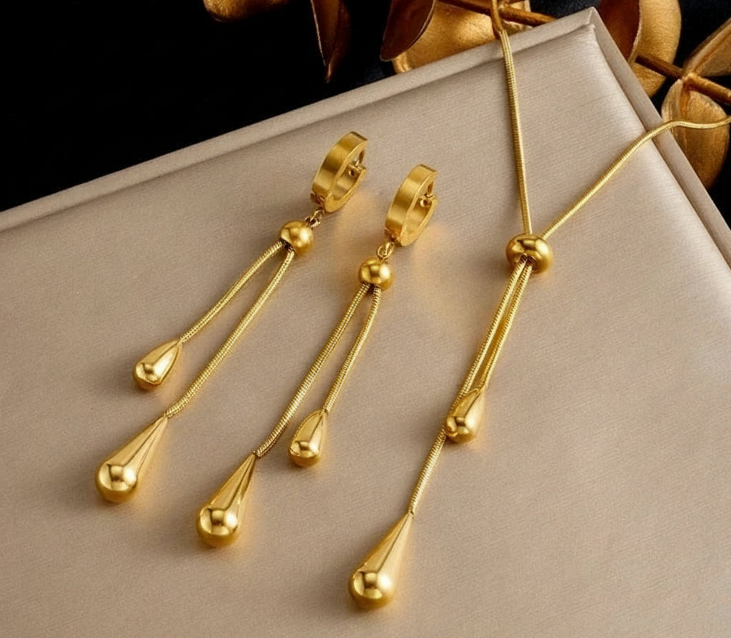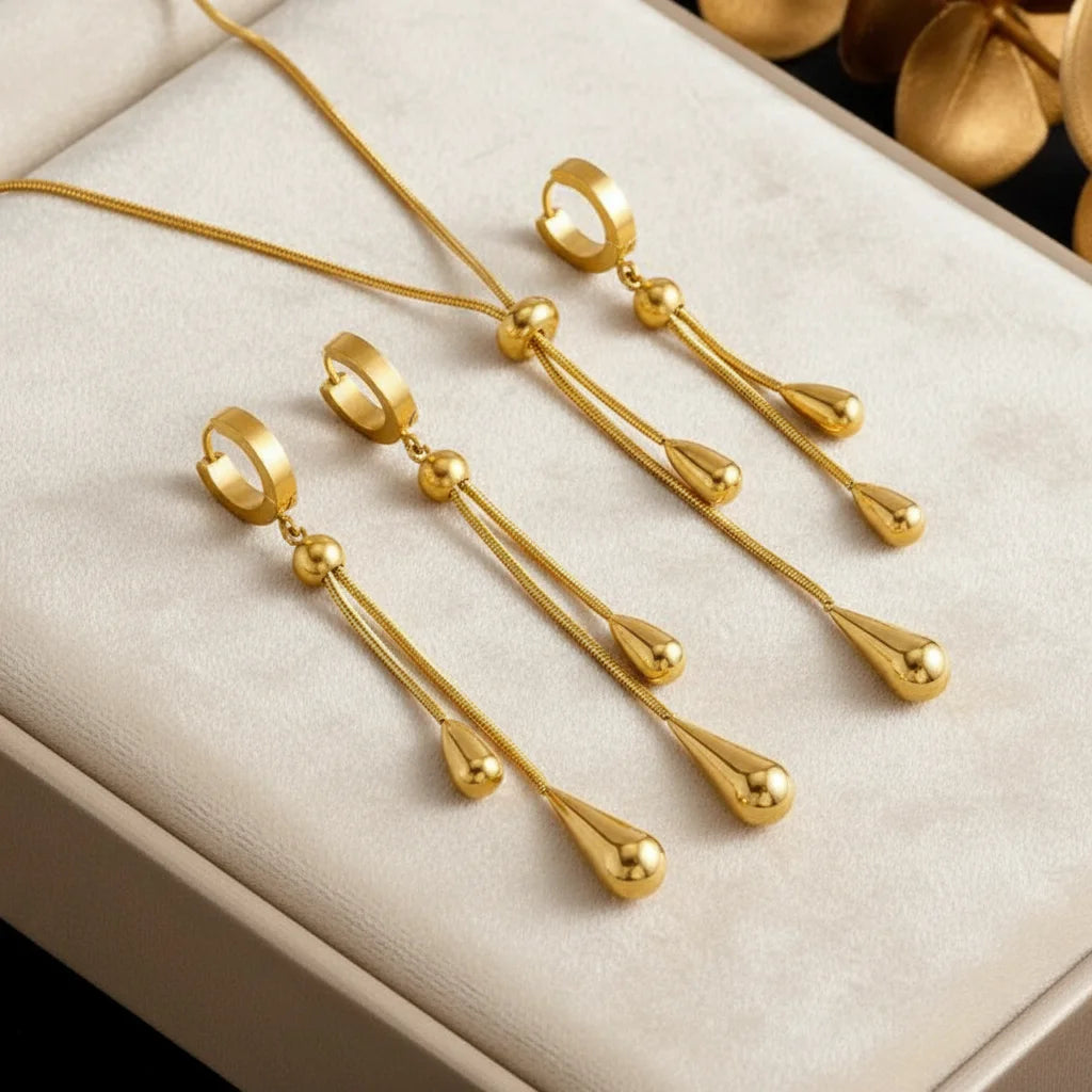 Révélez votre élégance cachée. Cet ensemble goutte D'eau doré apporte une touche de luxe discret à chaque instant. Idéal pour celles qui veulent briller sans en faire trop, ajoutant ce petit je-ne-sais-quoi à leur style. Transformez l'ordinaire en extraordinaire.