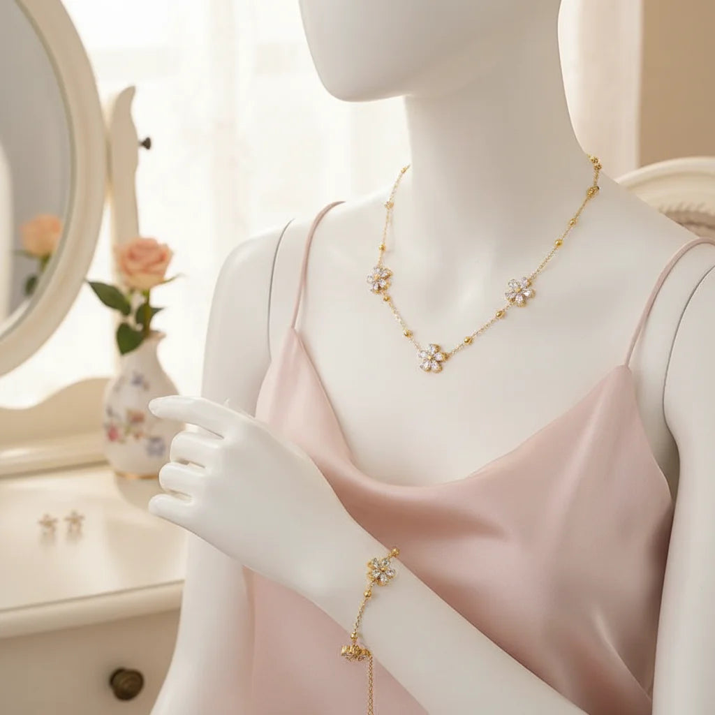 Un collier, un bracelet, des boucles. L'harmonie florale complète votre look, sans effort.