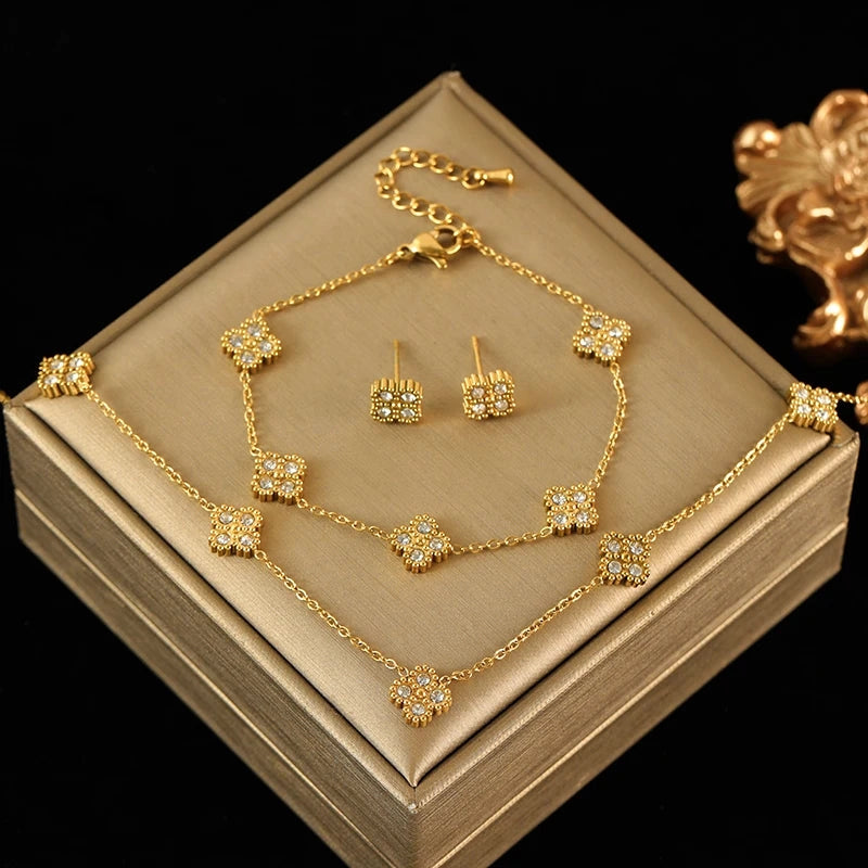 Chaque pièce de ce set est une ode à la beauté de la nature, avec ses cristaux scintillants arrangés en délicates fleurs dorées. Un chic discret qui attire tous les regards.