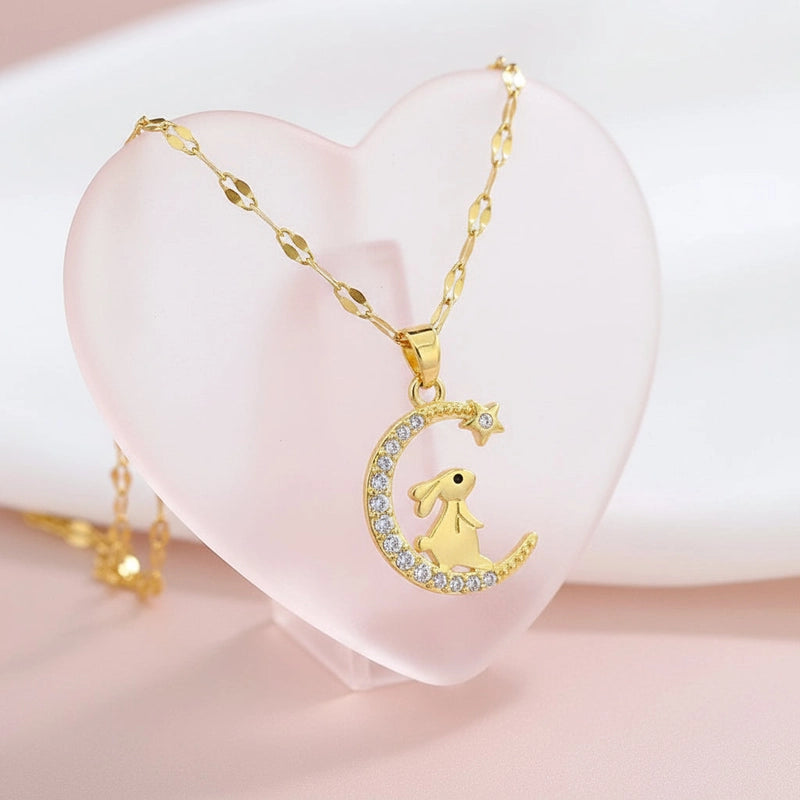 ​Ce collier lune et lapin en finition dorée est un bijou délicat qui réveille instantanément votre âme d’enfant.