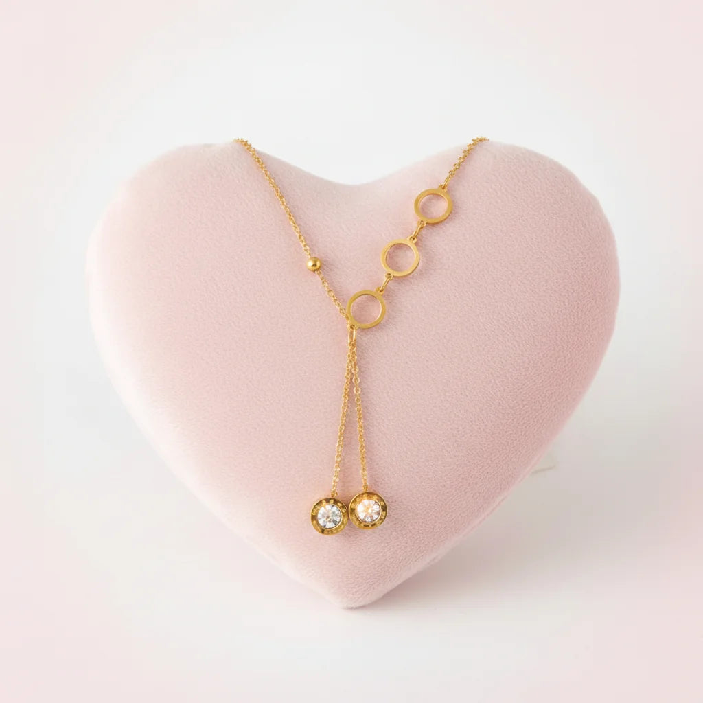 Ce sautoir raffiné met en valeur deux cercles ajourés de tailles différentes, sublimés par des oxydes de zirconium étincelants qui créent un jeu de lumière élégant.