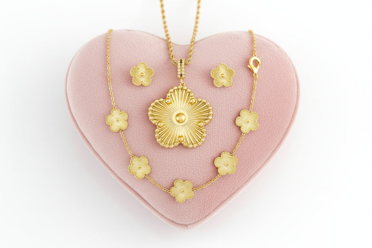 Cette parure est un rêve éveillé. Le doré est si doux, si lumineux, et les textures si fines qu'on croirait sentir le parfum des fleurs. C'est une touche de grâce et de poésie qui m'accompagne partout. Je me sens sublimée, comme une fleur qui s'épanouit au soleil. Un investissement dans la beauté intemporelle que je recommande chaleureusement à toutes celles qui aiment la distinction.